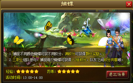 3.先捕捉100只蓝蝴蝶,得1000积分,得7600历练,得4056000经验