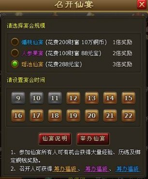 系统有一个气氛值作为衡量热闹程度的标准。参与宴会的人数越多,气氛值则越高。在帮派商店中,可以购买仙宴烟花、仙宴传音和仙宴侍女,使用这3种道具都可以增加宴会的气氛值。