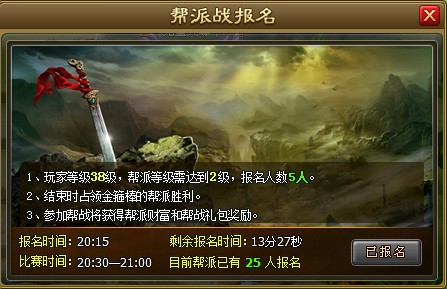 1、帮派战首先当然是要加入一个帮派。实力越强大越好,当然小帮也没关系,醉西游的帮派战小帮也有小帮的玩法一点也不比大帮弱。因为帮派战报名是有等级和人数限制的,首先你得把帮派的等级升级到2级并捐献100的铜币,然后找到5个志同道合的好基友在帮派战的时间一起报名就可以参加了。