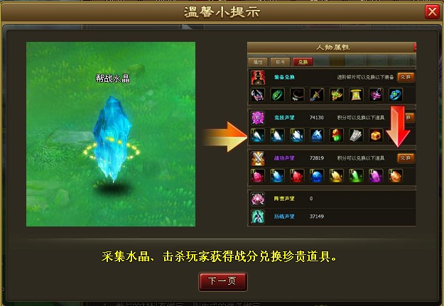 4、如果你在弱小一些的帮派,在占领后拿到战分就可以想着怎么带领帮派的兄弟一起去赚取更多的战分了。回到你们开始占领的封印处,并守住这个封印(因为占领封印后,你帮派兄弟复活就都在封印这了。不用在最初的出生点和其他帮派混杂在一起了,位置也更好,进可占领神针,退可采集帮派水晶,并采集封印附近草地上刷新的帮战水晶,每个帮战水晶会有2战分来不断的积累战分。帮战水晶采集完后下次刷新出来是需要一定时间的。