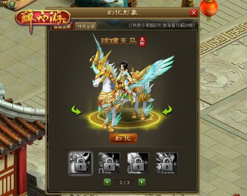 当玩家达到一定等级,并且成功培育出三阶以上的坐骑,便可开启坐骑飞行。同时,随着阶段的提升,玩家还可以将坐骑幻化成各种炫酷的造型。上至云龙下至天马,更有造型独特的萌兔和金刚。你是否心动了呢?一同来幻化你心仪的坐骑吧。