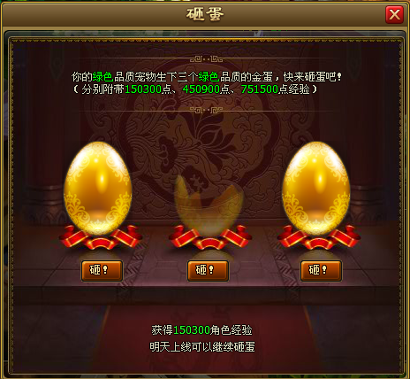 有宠物之后,上方图标会出现砸蛋标志,进去后就能享受你的宝宝给你带来丰厚的经验哦!(PS:不同资质的宝宝给你的经验是完全不同的!)