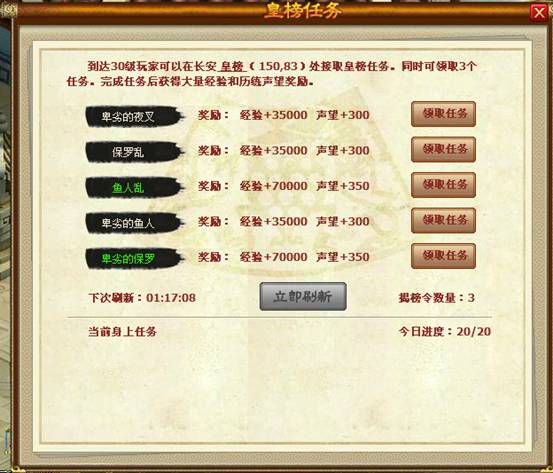 1. 玩家在长安城皇榜处接取皇榜任务,同时可领取3个任务;