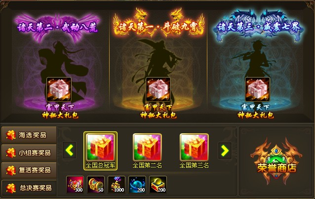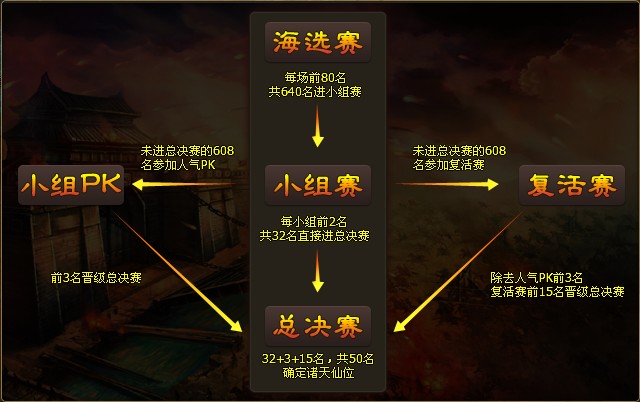 总决赛 | 小组赛、人气PK、复活赛晋级的50名 | 1、共2场,每场5次比赛 | 1、根据胜利的比赛次数,确定诸天排位 |