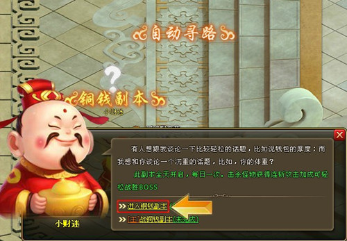 铜钱副本顾名思义是纯粹的刷钱玩法。铜币副本是单人副本,可以在长安城中央广场的NPC小财迷处进入,每天只能进入1次。铜币副本限时15分钟,分为2个阶段:小怪阶段和BOSS阶段。